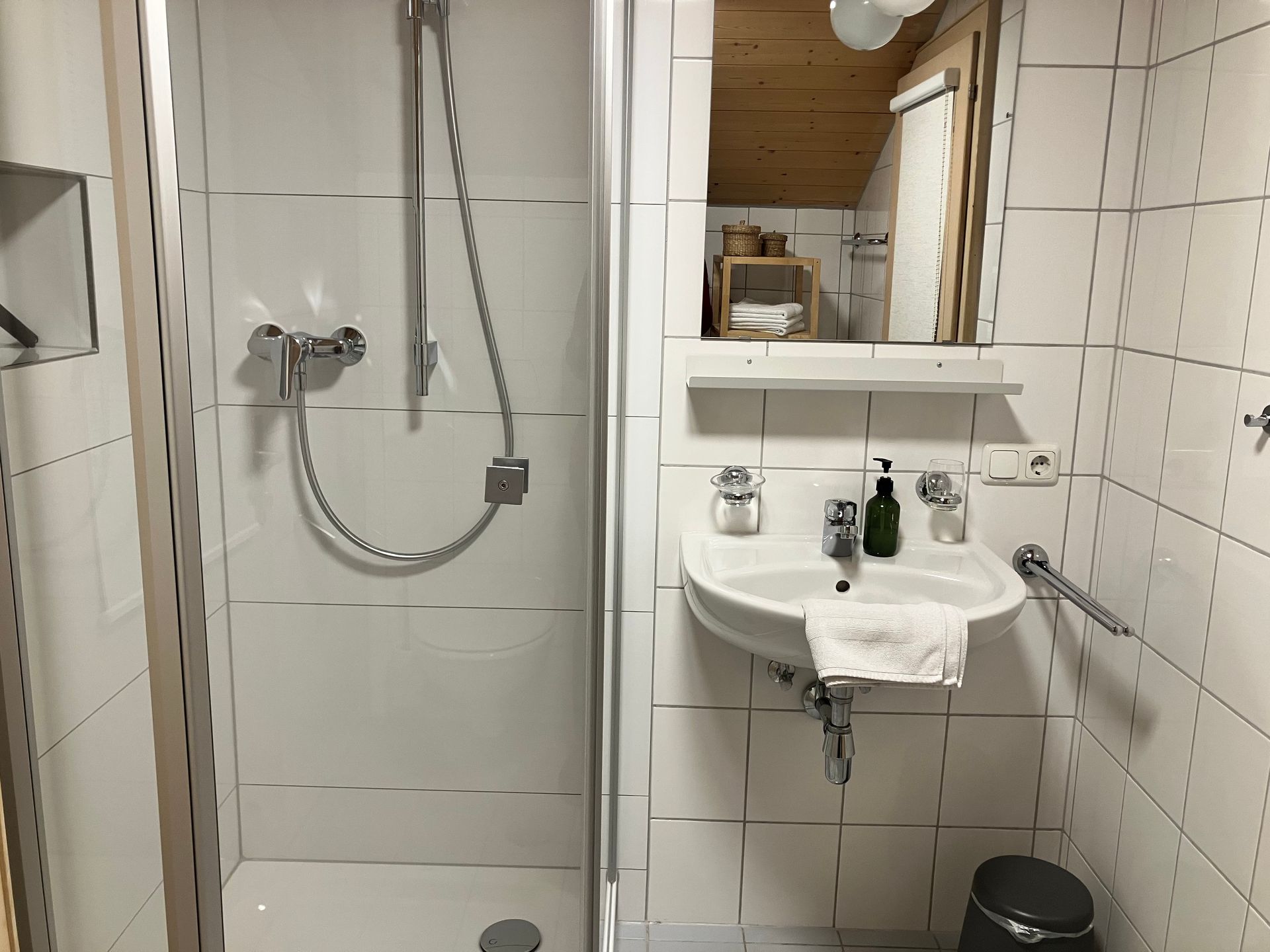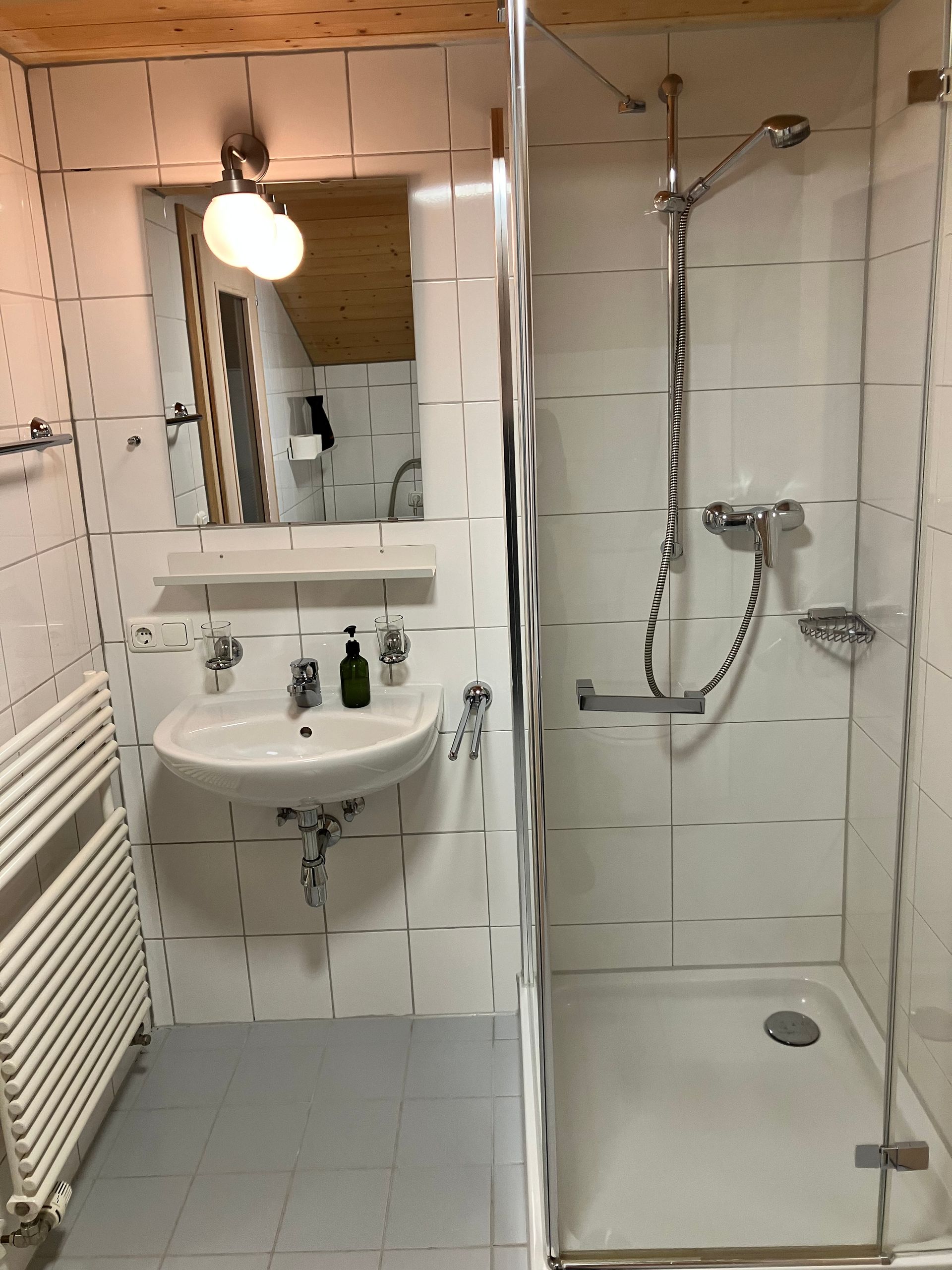 Kleines Badezimmer mit schmaler ebenerdiger Dusche zwischen Wohn-Esszimmer und Schlafzimmer
