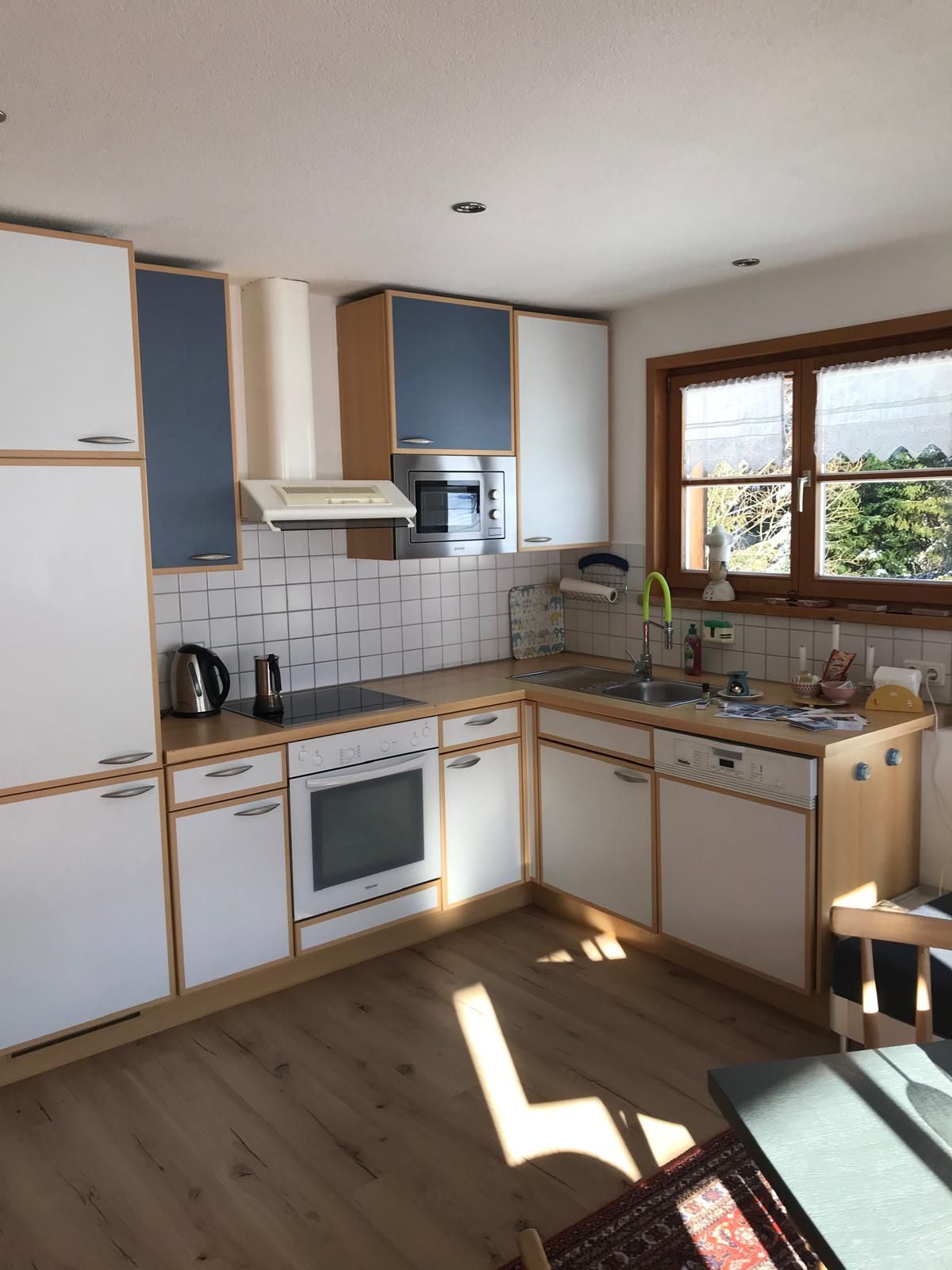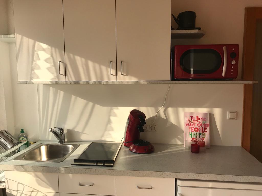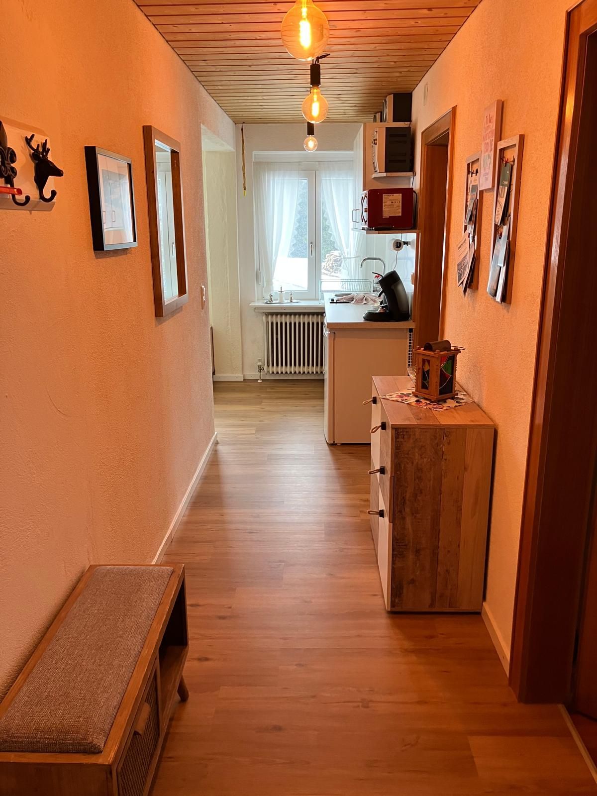 Küche und Flur (Kühlschrank mit Eisfach, Senseo Kaffeemaschine, Wasserkocher, Mikrowelle, 2 Cerankochfelder, Spüle)